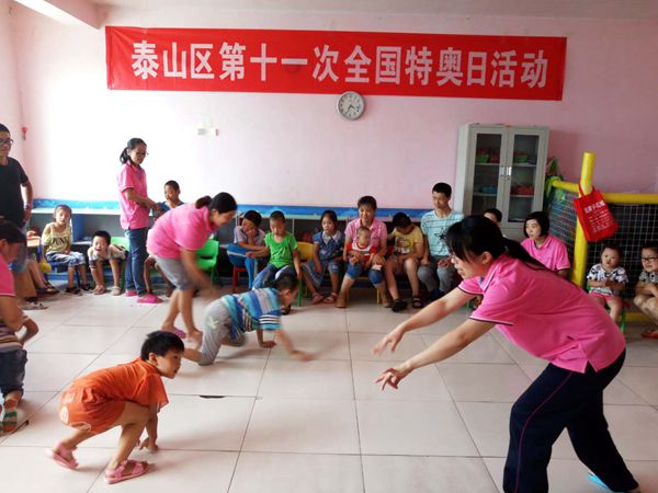 7月20日,是第十一次全国特奥日,泰山区为了让残障儿童突破身心障碍,提高他们参与社会生活的能力,从而达到康复健身、强壮身体的目的,在小天使儿童康复中心举办了“泰山区第十一次全国特奥日活动”。70多名老师、家长、残障儿童参与了活动。